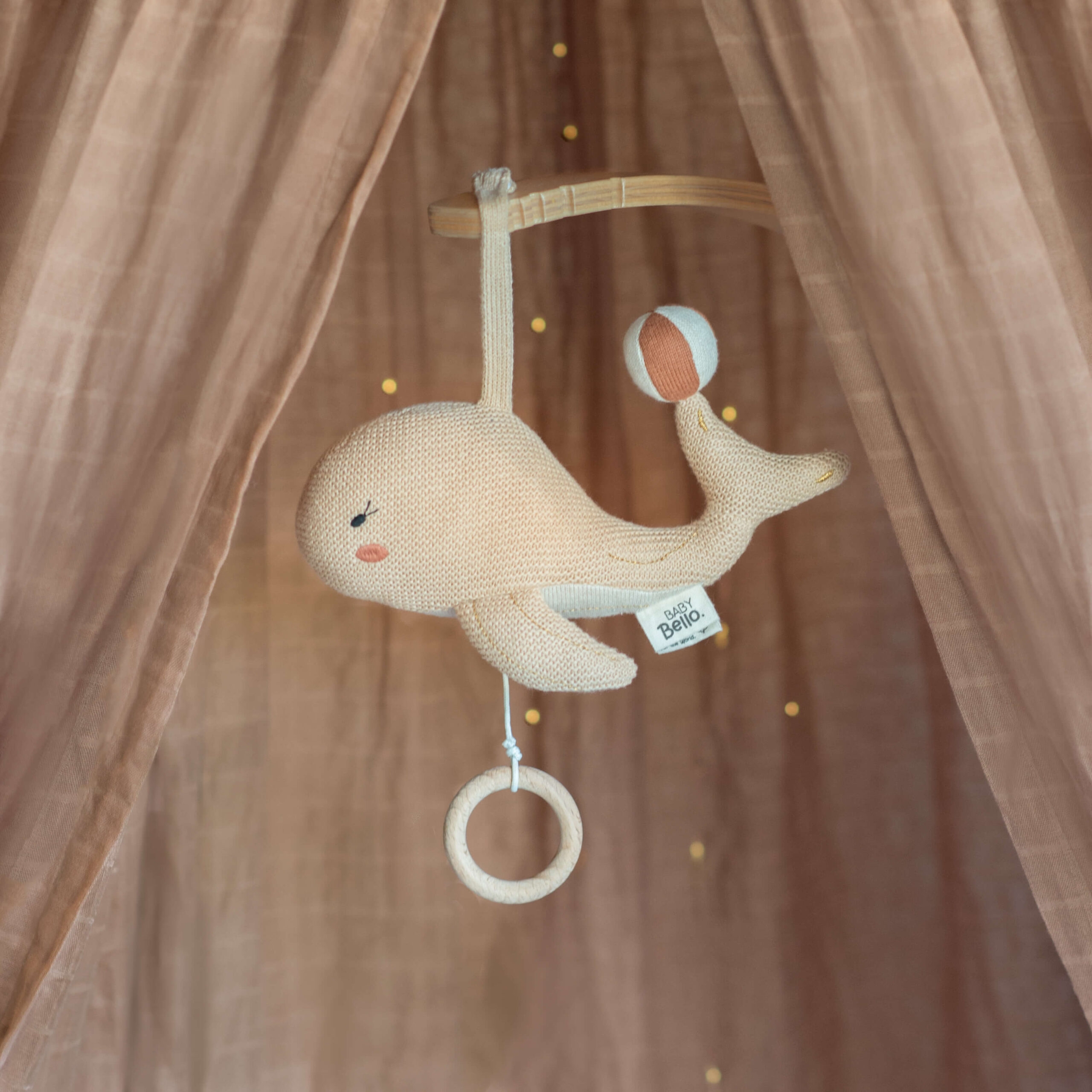 Als Musikmobile, das sanft Brahms Wiegenlied spielt, wird Wally in der Farbe Sandshell sicherlich schnell zum neuen Freund und kann zum Beispiel an der Wiege befestigt werden.