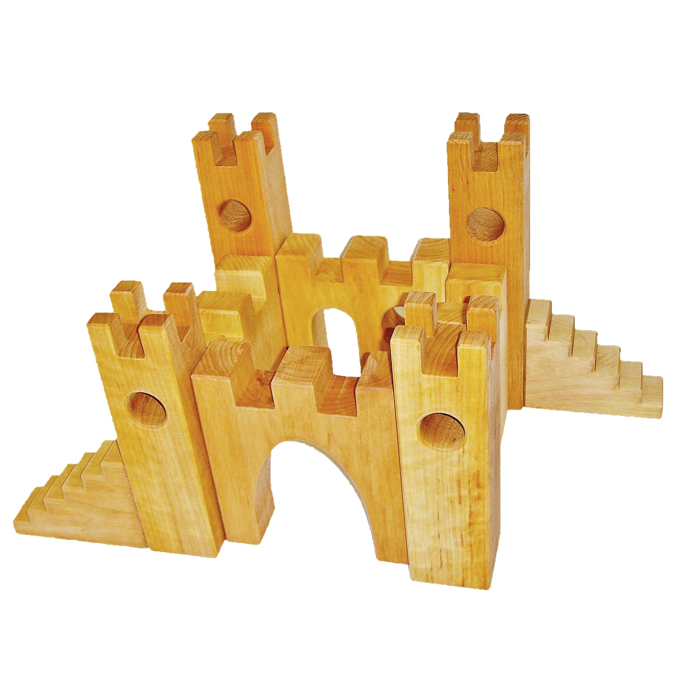 Die Ritterburg aus Holz von BAUSPIEL besteht aus zehn Teilen.