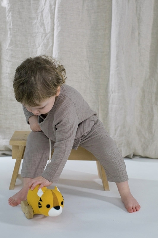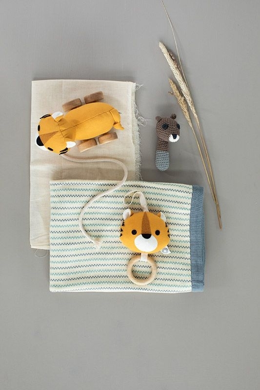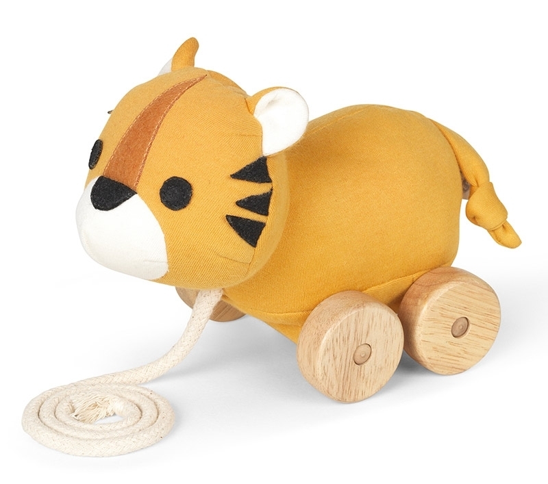 Der Tiger ist aus 100% zertifizierter Biobaumwolle, die mit unbedenklichen Farben bedruckt ist. Die Füllung besteht aus 100% Maisfaser, die Schnur aus 100% Baumwolle die Filz-Aplikationen aus 50% Baumwolle / 50% Polyester. Die Räder sind aus Plantagen-Kautschukbaumholz gefertigt.