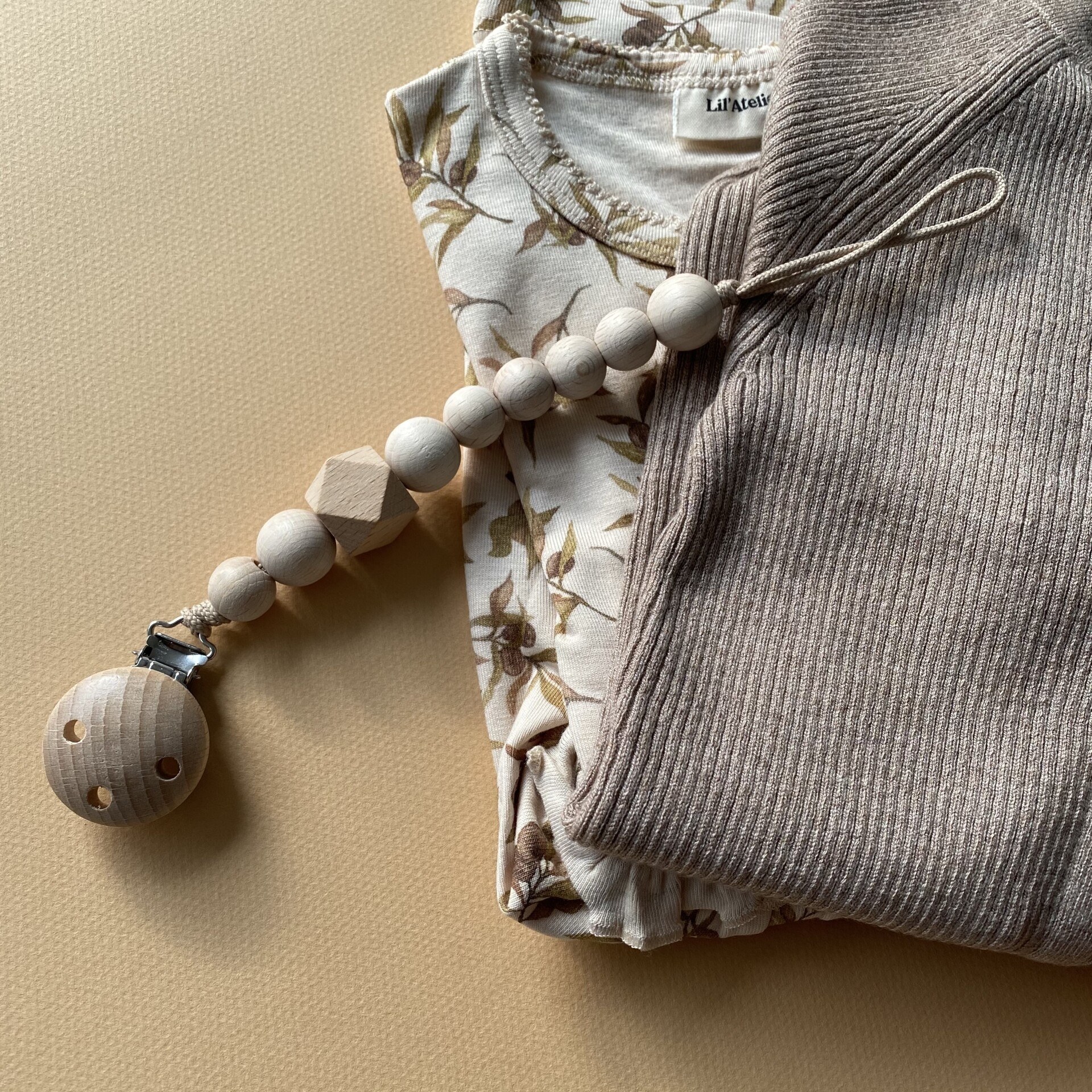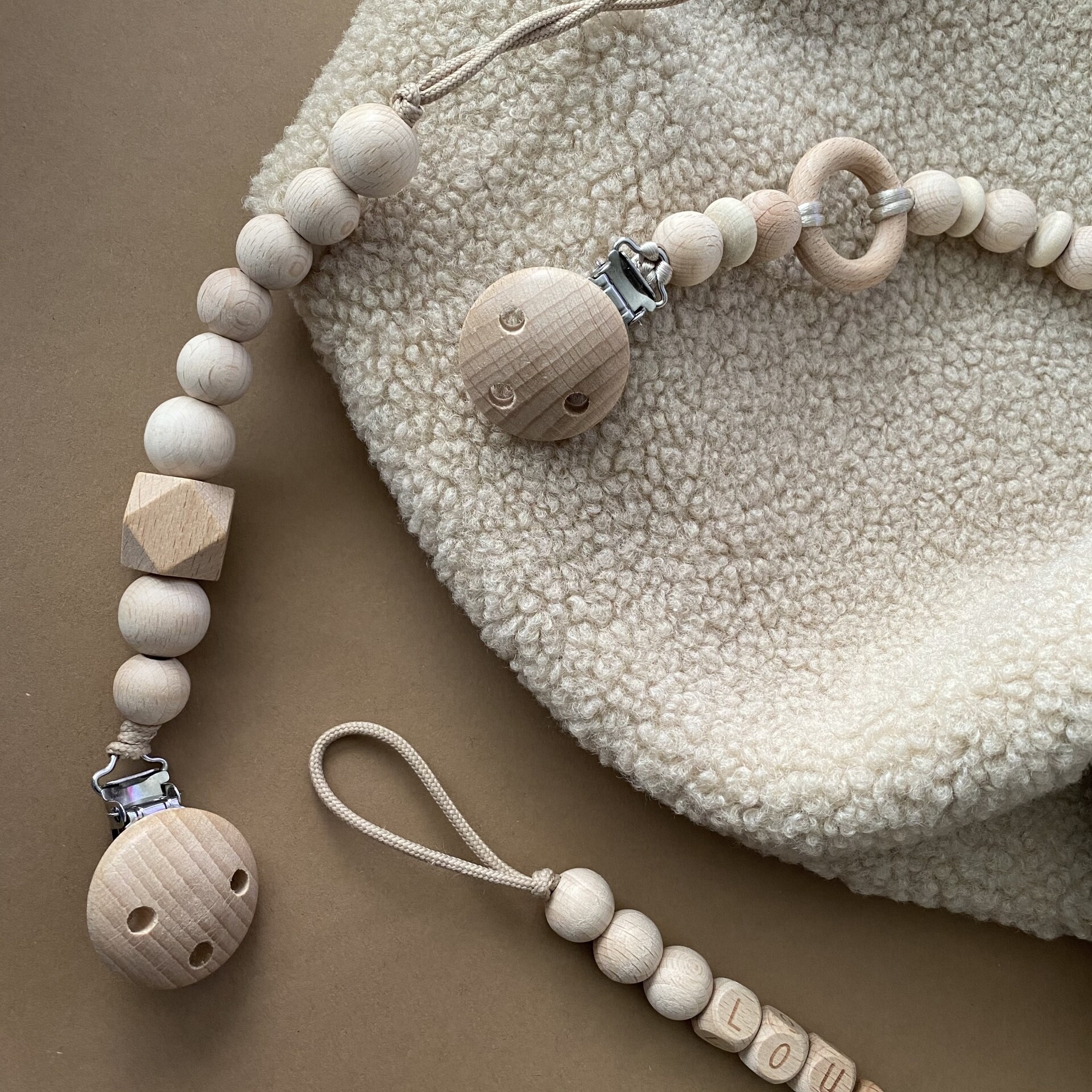 Dieses Babyspielzeug von friemel ist ein wunderschöner, dezenter Schnullerhalter aus naturfarbenen Holzperlen, der sicherlich schnell zu einem Lieblingsspielzeug des Babys wird.