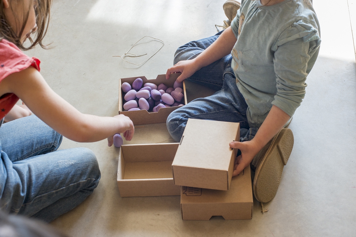 Die lilafarbenen Eier aus Massivholz sind treue Begleiter beim Spielen und Lernen.
