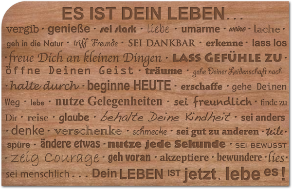 Viele Anregungen, das Leben bewusster wahrzunehmen und es zu genießen findet man als Motiv dieser bezaubernden Holzkarte.
