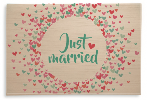 Der Schriftzug "Just married" ist die Aussage dieser bunten Holzkarte.