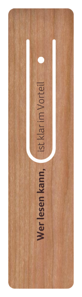 Das hochwertige Lesezeichen von Holzpost® ist aus massivem Kirschbaumholz gefertigt und mit dem Schriftzug "Wer lesen kann, ist klar im Vorteil" graviert.