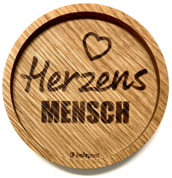 Der runde Untersetzer von Holzpost® ist aus massivem Eichenholz gefertigt und mit diesem Schriftzug "HerzensMensch" und einem Herz graviert.