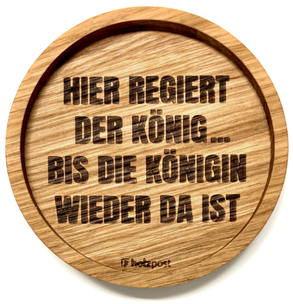 Der runde Untersetzer von Holzpost® ist aus massivem Eichenholz gefertigt und mit diesem Schriftzug graviert.