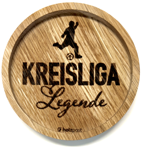 Der runde Untersetzer von Holzpost® ist aus massivem Eichenholz gefertigt und mit dem Schriftzug "Kresiliga Legende" und einem Fußballspieler graviert.