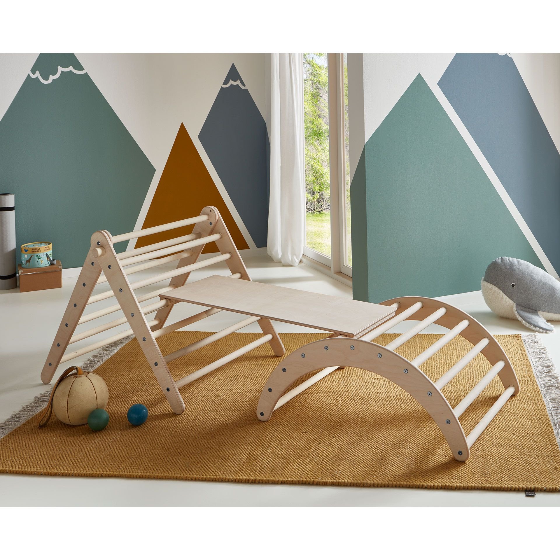 Hoch hinaus geht es erst einmal in die Berge auf dem klappbaren Kletterdreieck. Der Abstieg ist zu beschwerlich oder die kleinen Kletterfreunde möchten mehr Action? Dann ab auf das Rutschbrett und hinab geht es ins Tal. Oder doch lieber die Brücke nehmen und ohne nasse Füße über den plätschernden Bach wandern? Dann verbindet mit dem Rutschbrett einfach den Kletterbogen mit dem Kletterdreieck und schon ergibt sich die nächste Spiel- und Klettermöglichkeit. Das war nun alles ganz schön anstrengend, oder? Kein Problem, wie wäre es mit ein bisschen Abhängen in der Schaukel, die sich nämlich ergibt, wenn man den Kletterbogen umdreht. Ein paar Decken und Kissen dazu und schon wird es gemütlich und das Mittagsschläfchen kommt heute mal wie von selbst. Kein Wunder, nach solchen Kletter-Abenteuern.