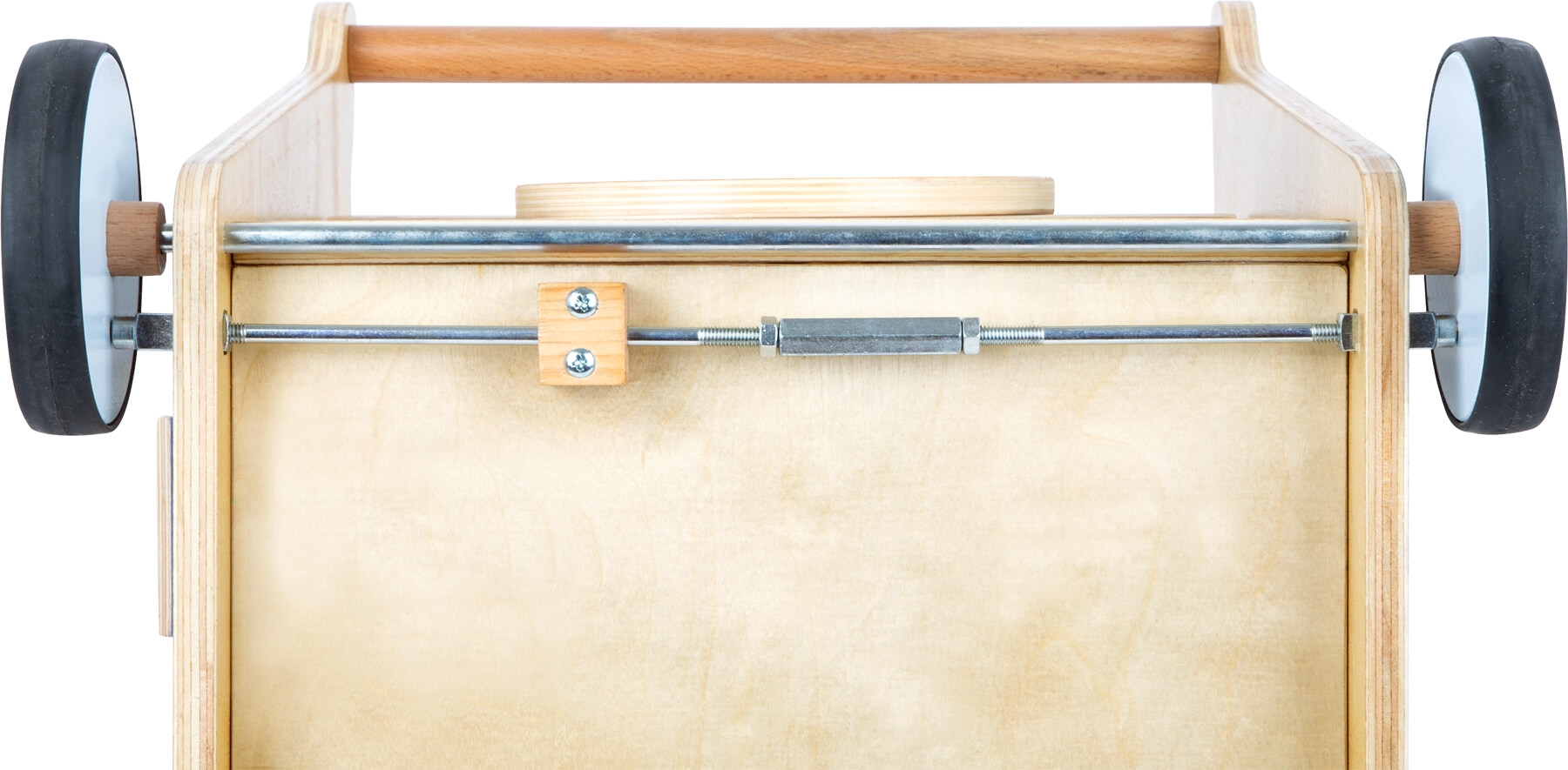 Dank der gummierten Rollen hat man ein leises Laufgeräusch auf allen Böden. Das integrierte Bremssystem sorgt zudem für ein sicheres Laufenlernen. Die Achse aus Metall ist durchgängig. Ein Klemmschutz sorgt dafür, dass die kleinen Händchen sicher vor einem zufallenden Deckel sind.
