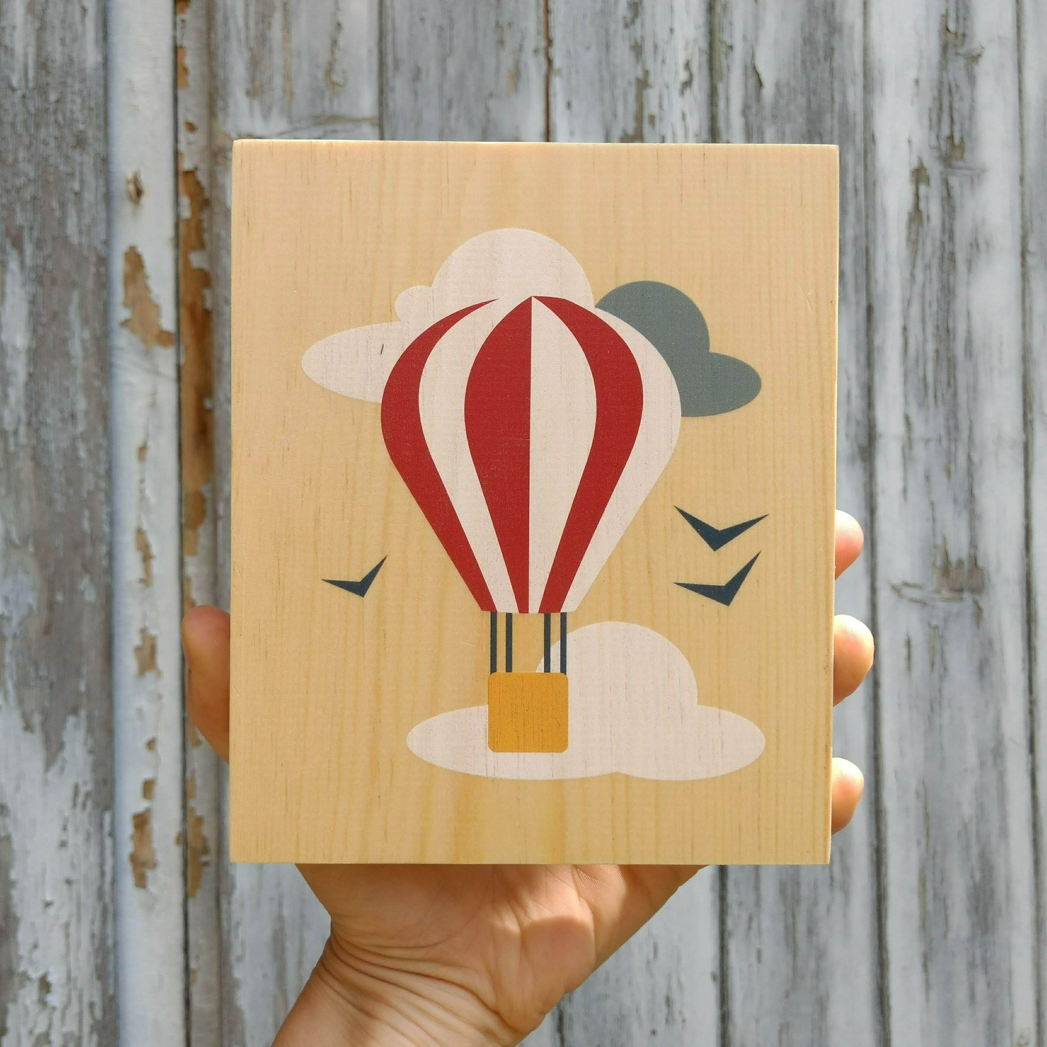 Diese Illustration mit dem fliegenden Heißluftballon macht sich nicht nur gut an der Wand, sondern kann auch im Regal, auf dem Schreibtisch oder auf der Kommode stehen.