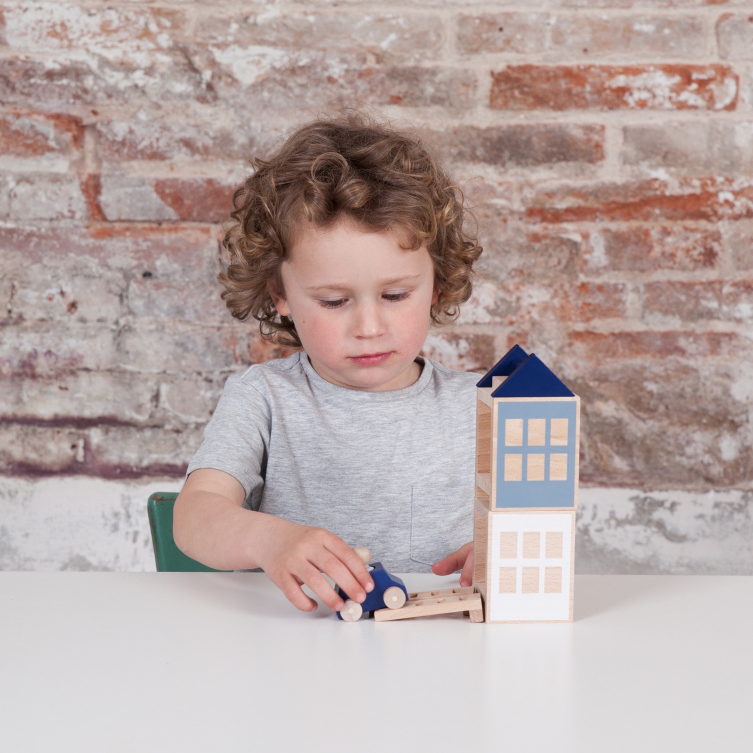 Zwei stapelbare Haus-Elemente, ein Dach, zwei Leitern, ein Holzauto und eine Holzfigur gehören dazu. Alles ist in schlichtem blau-grau-weiß-natur gehalten.