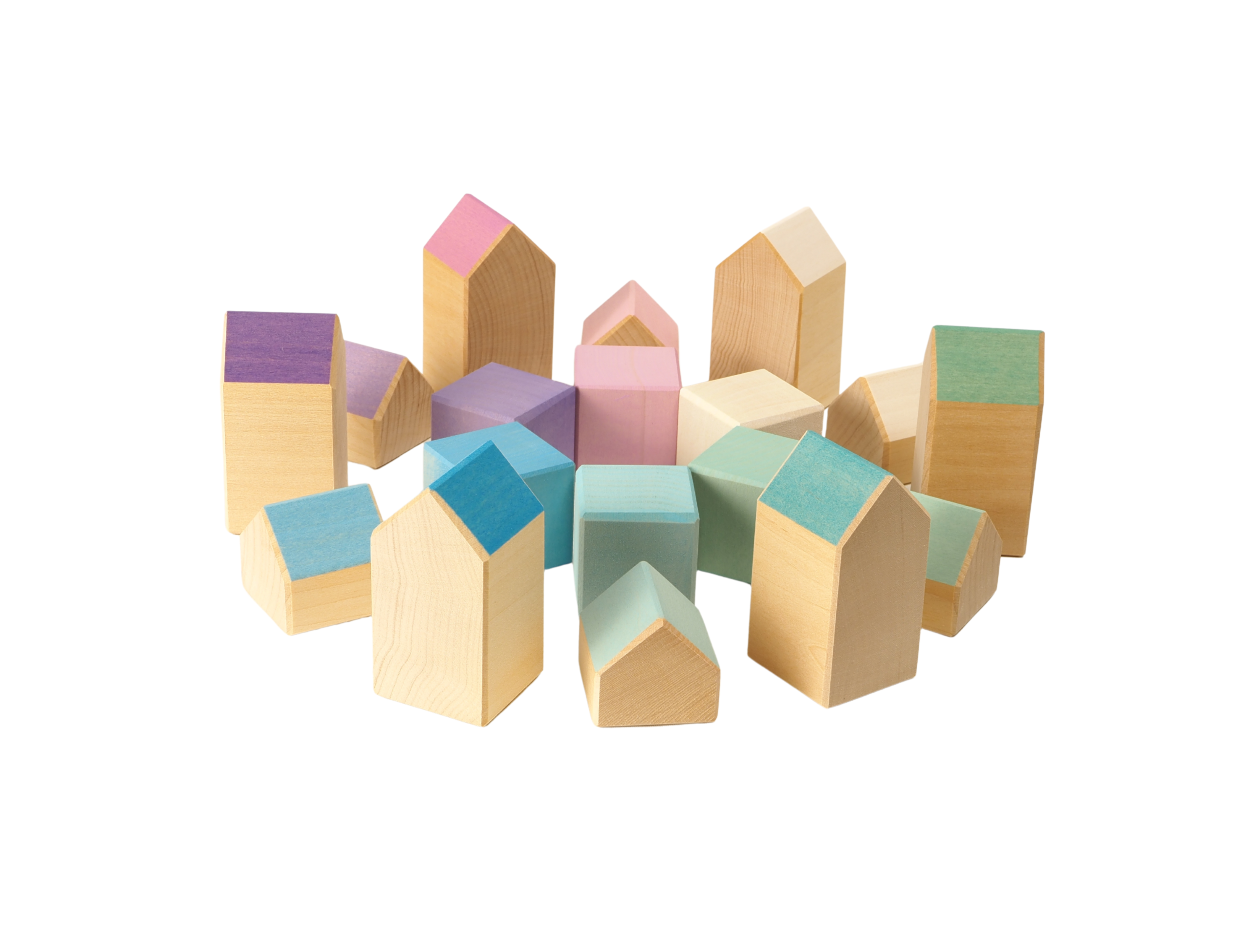 Mit 6 großen und 6 kleinen Häusern sowie 6 bunten Würfeln in harmonisch, Winter-Farben lässt sich phantasievoll bauen und spielen.