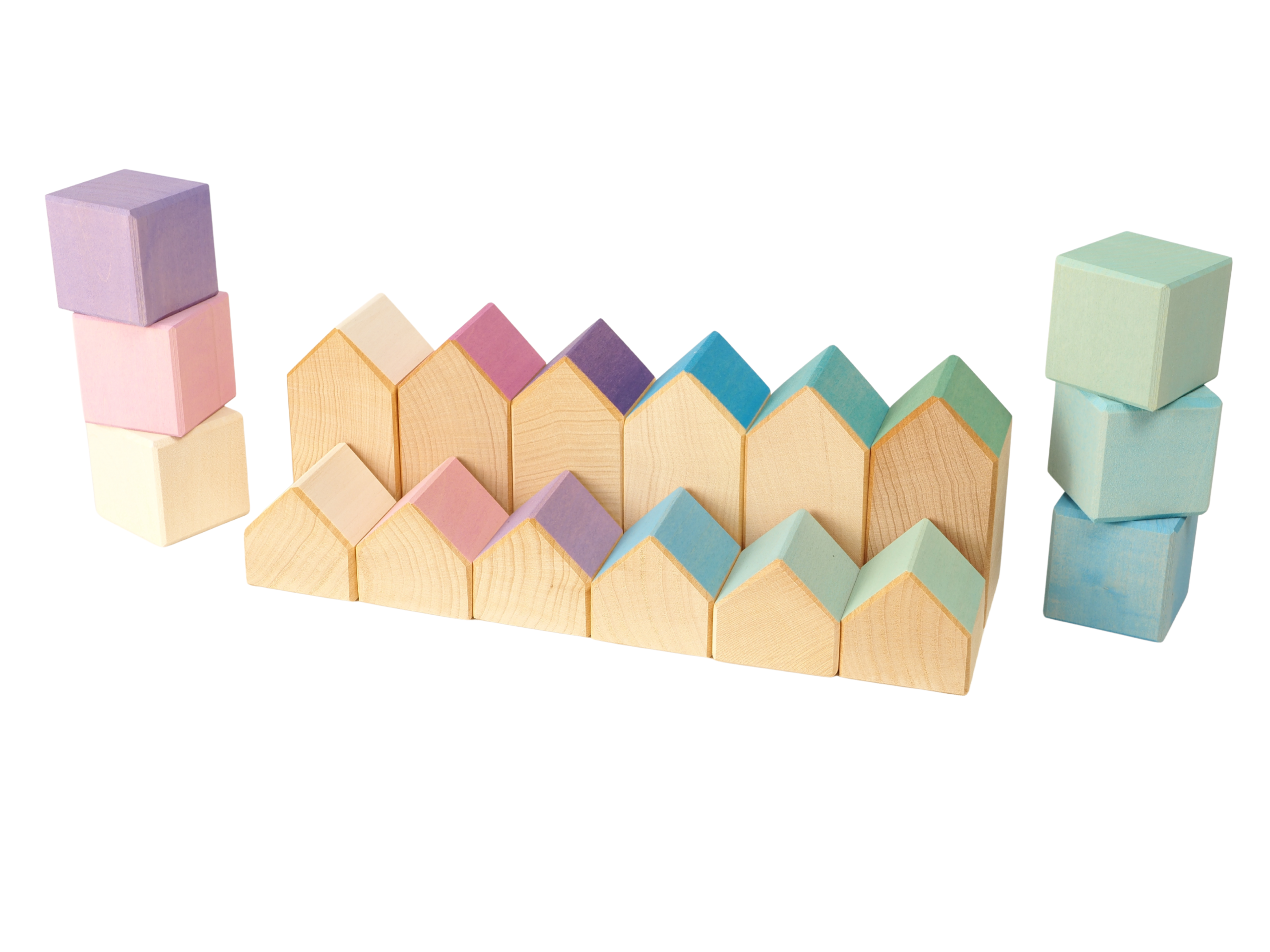Der Baukasten Houses and Cubes Color besteht aus einem Tablett, 6 kleinen und 6 großen Häusern sowie 6 bunten Würfel-Bauklötzen aus Buche.