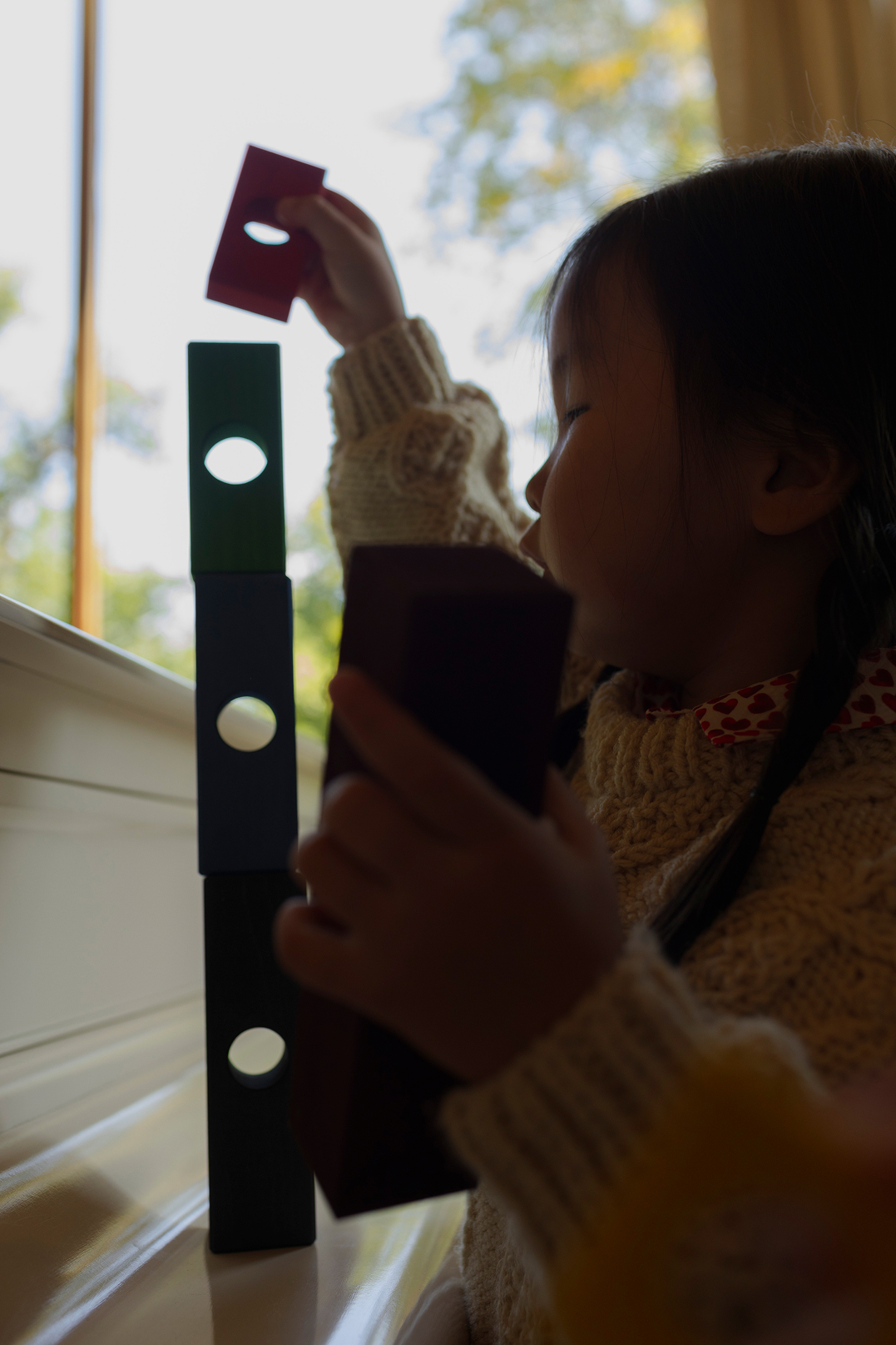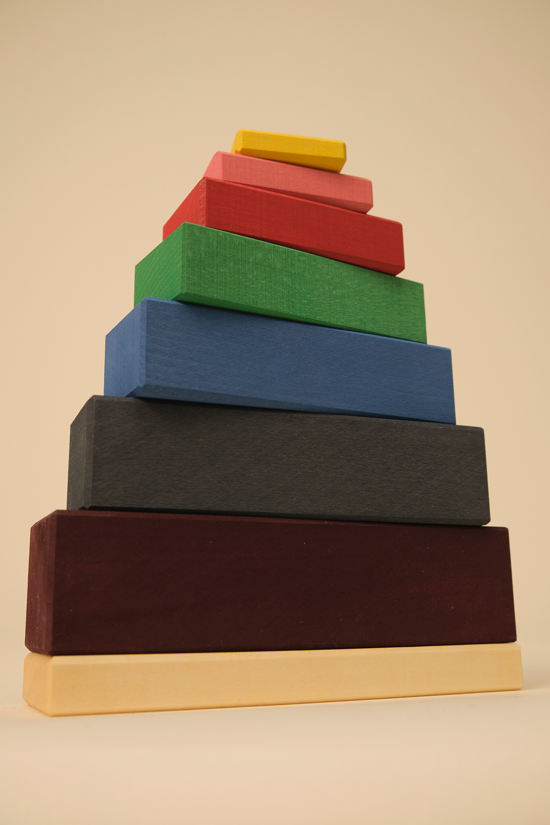 wie auch der Round Stacking Tower ein Stapelturm. Dennoch ist dieser anders: Sieben Rechtecke in unterschiedlichen Längen, Holzstärken und Farben. Diese aber nicht wie ein Regenbogen angeordnet,