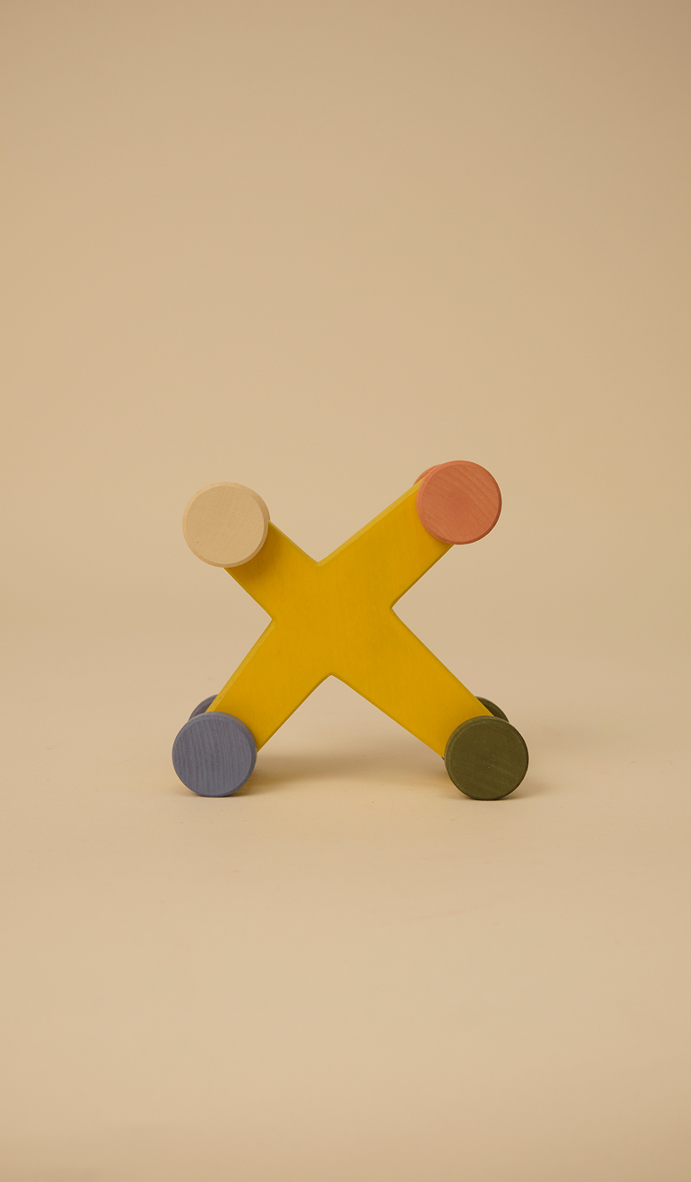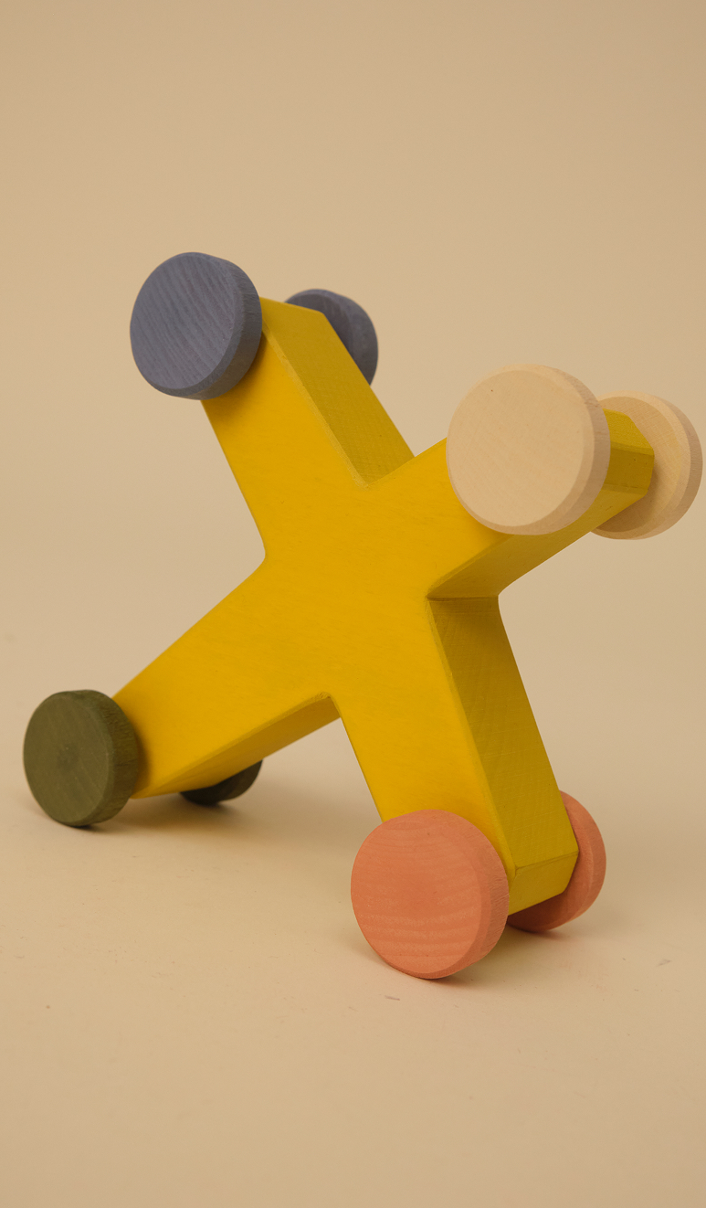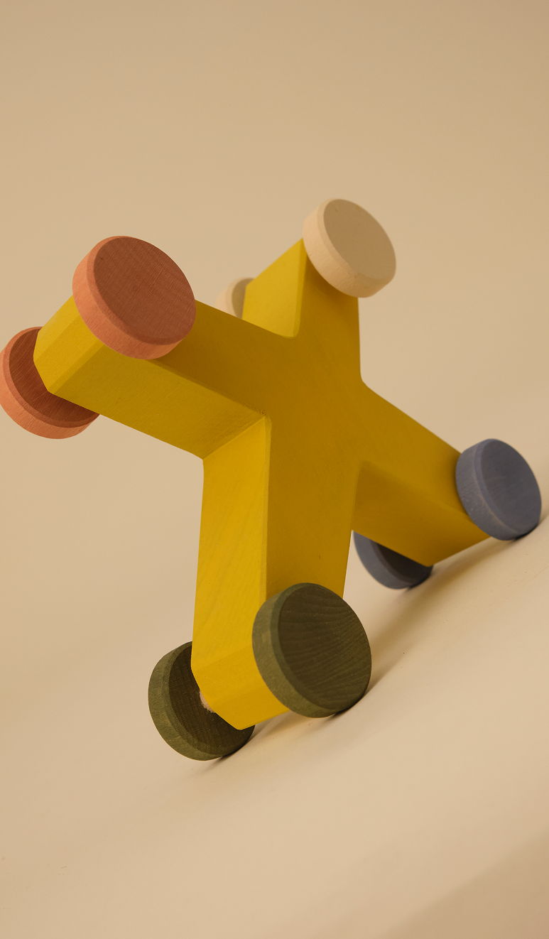 Das gelbe Cross Vehicle ist eines der lustigen Holzfahrzeuge von TOYTO. Das Besondere daran? Es ist ein wahrer Akrobat! Denn wer kann sich schon so elegant überschlagen und Flik-Flaks machen? Es lässt sich außerdem toll auch von kleinen Händchen greifen. Und neben der ungewöhnlichen Form sind es sicherlich auch die Anordnung der Räder, die auffallen. Denn egal, wie man es dreht, das Cross Vehicle fährt auf einem rosa-weißen, auf einem grün-rosa, einem grün-blauen, einem blau-weißen Räderpaar. Und wieder zurück. Kleine Passagiere passen übrigens auch super in die Vertiefungen.