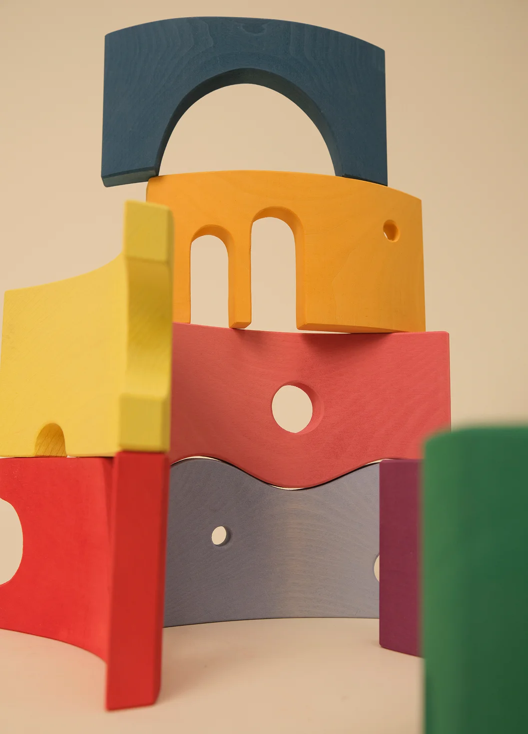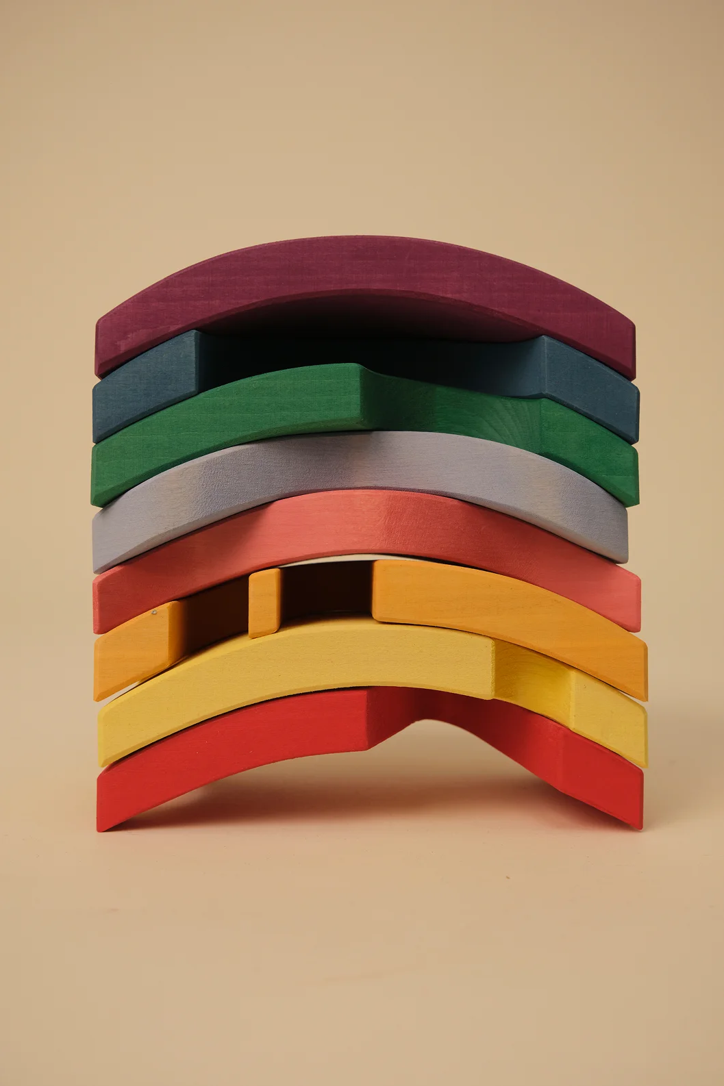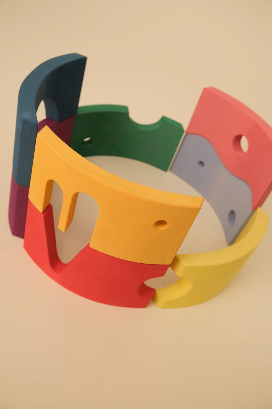 Der Unterschied liegt auf den ersten Blick vielleicht zum einen in Farben und Form. Er ist deutlich flacher und jedes Teil hat die gleiche Größe. Aber während er von der einen Seite ein normaler Regenbogen aus Holz zu sein scheint, birgt die andere Seite eine echte Überraschung, die den besonderen Unterschied macht. Die einzelnen Elemente sind nämlich doch alle unterschiedlich und haben verschiedene Ausparungen, die sich vertikal und horizontal miteinander verbinden lassen. Es entstehen visuelle Silhouetten, zum Beispiel ein Herz. Baut ein Kolosseum, einen Turm, spielt Schattentheater, entwerft einen Murmelparcours, baut eine Buckelpiste oder Brücke.