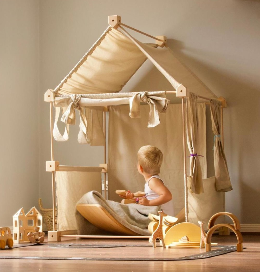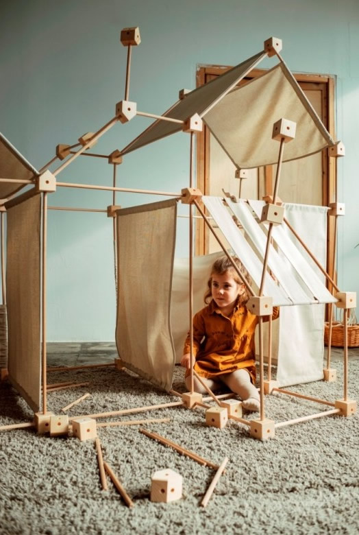 Das Baukastenspiel ist einfach erklärt: Es geht darum, die Vierkant- und Winkelklötzchen mit den Leisten zu verbinden. Hierbei sind nur bestimmte Verbindungen erlaubt, was zum Nachdenken anregen soll. Werden die Leisten dann noch mit den Stoffstücken kombiniert, lassen sich die tollsten Gebilde bauen!