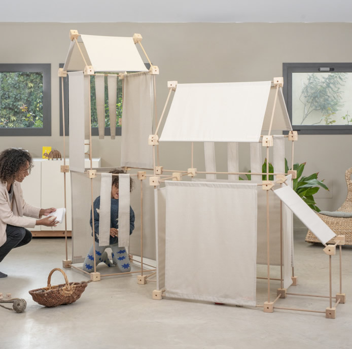 Das Baukastenspiel ist einfach erklärt: Es geht darum, die Vierkant- und Winkelklötzchen mit den Leisten zu verbinden. Hierbei sind nur bestimmte Verbindungen erlaubt, was zum Nachdenken anregen soll. Werden die Leisten dann noch mit den Stoffstücken kombiniert, lassen sich die tollsten Gebilde bauen!