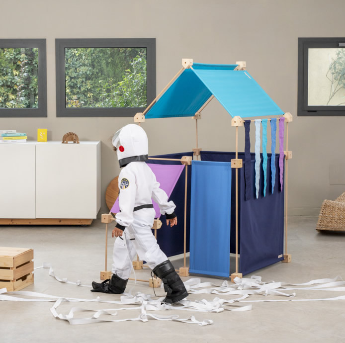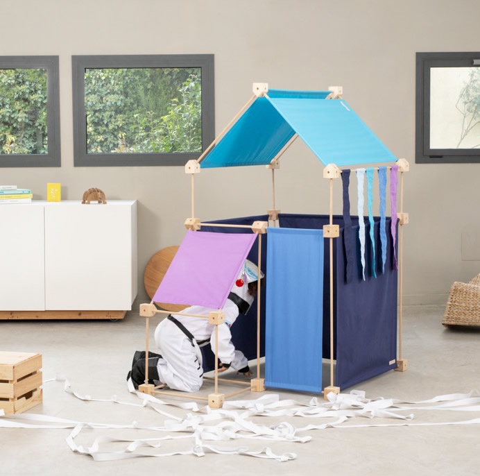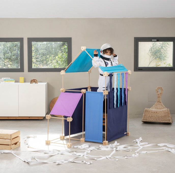 Das Baukastenspiel ist einfach erklärt: Es geht darum, die Vierkant- und Winkelklötzchen mit den Leisten zu verbinden. Hierbei sind nur bestimmte Verbindungen erlaubt, was zum Nachdenken anregen soll. Werden die Leisten dann noch mit den Stoffstücken kombiniert, lassen sich die tollsten Gebilde bauen!