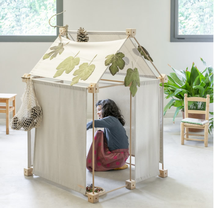 Das Set Trígonos Kernel enthält: 7 Vierkantklötzchen, 7 Winkelklötzchen, 12 lange Leisten, 4 mittlere Leisten, 8 kurze Leisten, 6 Stoffstücke aus Bio-Baumwolle in einer Box aus Hartpappe.