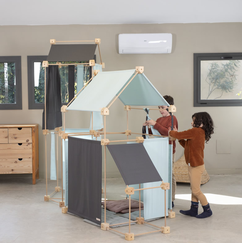 Das Baukastenspiel ist einfach erklärt: Es geht darum, die Vierkant- und Winkelklötzchen mit den Leisten zu verbinden. Hierbei sind nur bestimmte Verbindungen erlaubt, was zum Nachdenken anregen soll. Werden die Leisten dann noch mit den Stoffstücken kombiniert, lassen sich die tollsten Gebilde bauen!