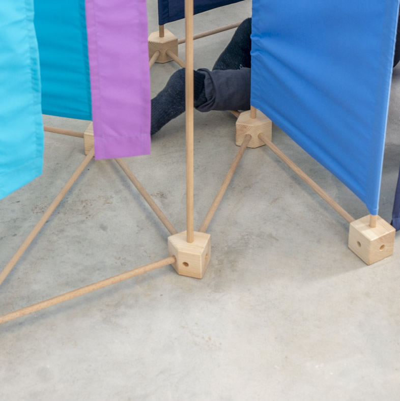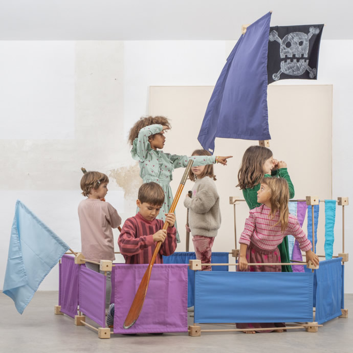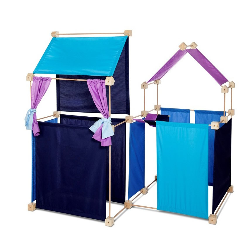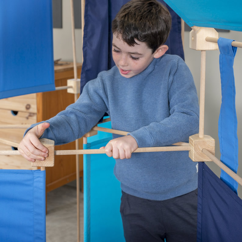 Das Baukastenspiel ist einfach erklärt: Es geht darum, die Vierkant- und Winkelklötzchen mit den Leisten zu verbinden. Hierbei sind nur bestimmte Verbindungen erlaubt, was zum Nachdenken anregen soll. Werden die Leisten dann noch mit den Stoffstücken kombiniert, lassen sich die tollsten Gebilde bauen!