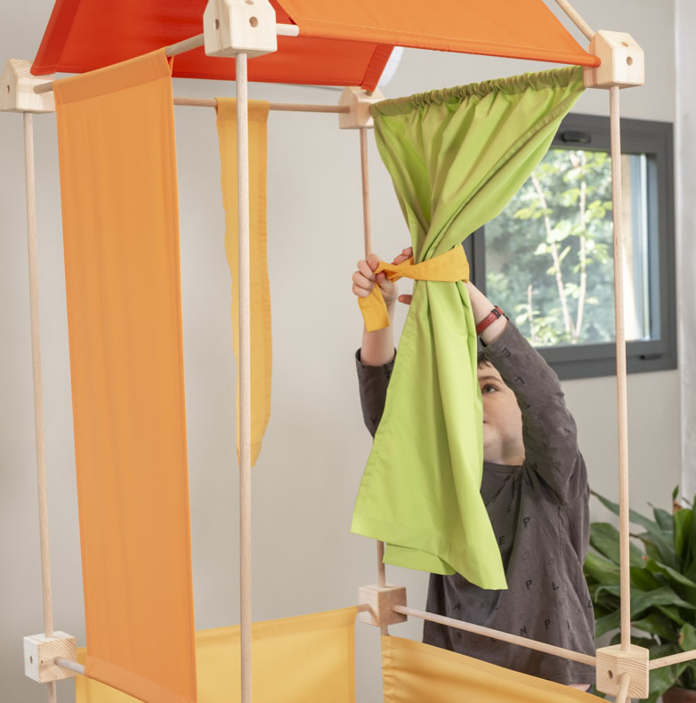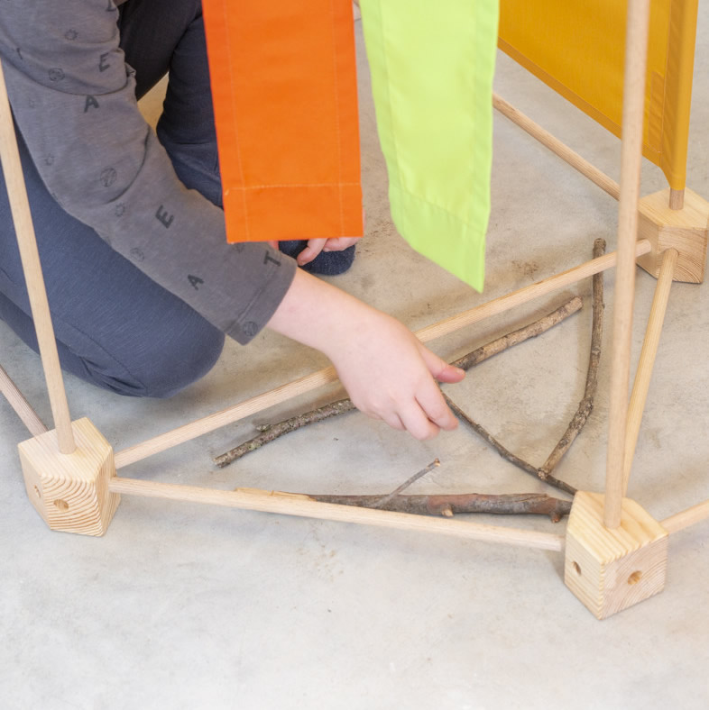 Das Baukastenspiel ist einfach erklärt: Es geht darum, die Vierkant- und Winkelklötzchen mit den Leisten zu verbinden. Hierbei sind nur bestimmte Verbindungen erlaubt, was zum Nachdenken anregen soll. Werden die Leisten dann noch mit den Stoffstücken kombiniert, lassen sich die tollsten Gebilde bauen!