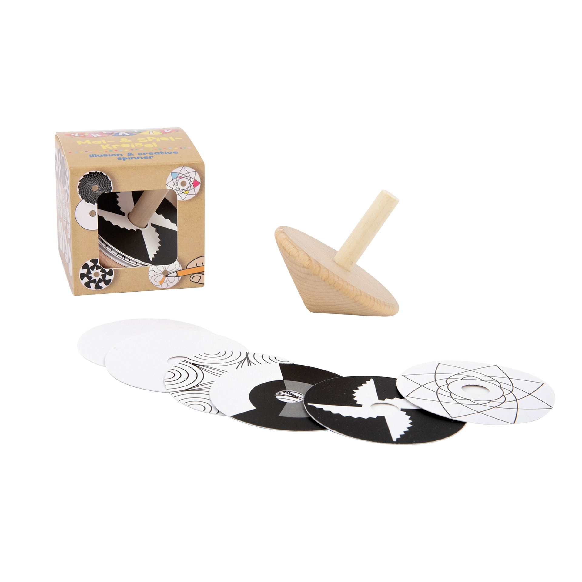 Der Holzkreisel wird mit sechs Papier-Kreiselplatten geliefert, von denen vier doppelseitig bedruckt sind. So gibt es vier optische Illusionen, vier Mustervorlagen zum Ausmalen und vier neutrale Scheiben zur freien Gestaltung.